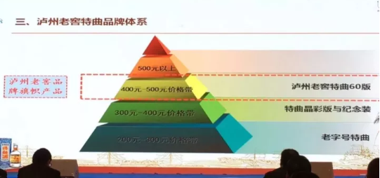 瀘州老窖特曲品牌體系方面,明確了瀘州老窖特曲60版為瀘州老窖品牌旗幟產品,占據400-500元價格帶;特曲晶彩版與紀念版占位300-400元價格帶;老字號特曲則搶占200-300元價格帶。該體系的明確,也意味著老窖明確了瀘州老窖特曲品牌插入次高端市場的三把“尖刀”。