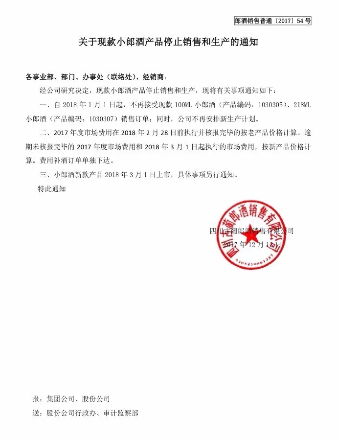 12月13日,郎酒銷售有限公司發布《關于現款小郎酒產品停止銷售和生產的通知》。