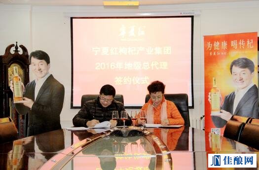 12月25日,寧夏紅集團2016年地級總代理簽約儀式在寧夏紅集團銀川總部隆重舉行,寧夏紅集團營銷中心副總經理汪泉山代表公司與萊州華裕商貿有限公司總經理秦愛華及青島鴻澤發商貿有限公司總經理鄭希恩簽訂了2016年商務合同,開啟了寧夏紅打造“千萬級”經銷商的新篇章。