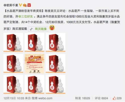 2015年12月30日上午十點,為期15天的水晶葫蘆酒二期眾籌(線上)圓滿結束,以“水晶葫蘆酒(限量賀歲版):一款市面上買不到的好酒”為名在線上眾籌金額達223551元,超目標金額226%,支持人數為450人。
