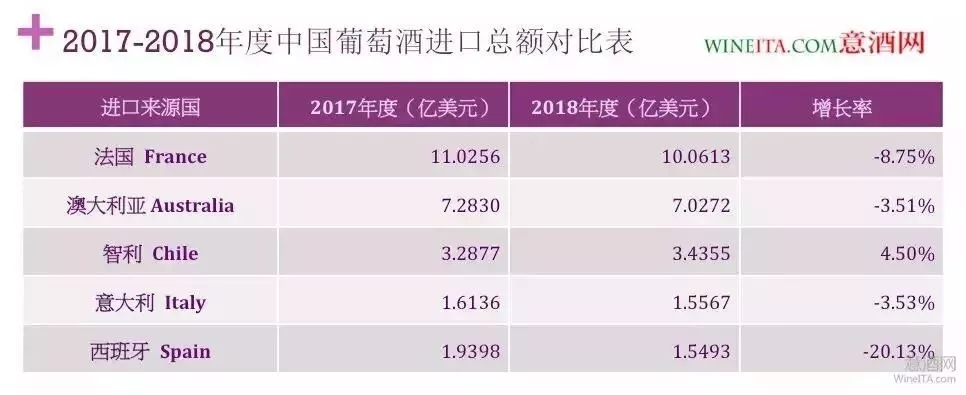 2018年1-12月,中國市場法國葡萄酒進口額為10.0613億美元,相比2017年度的11.0256億美元下降8.75%;澳大利亞葡萄酒進口額為7.0272億美元,相比2017年度的7.2830億美元下降了3.51%;智利葡萄酒進口額為3.4355億美元,相比2017年度的3.2877億美元增長了4.5%;意大利葡萄酒進口額為1.5567億美元,相比2017年度的1.6136億美元下降3.53%;西班牙葡萄酒進口額為1.5493億美元,相比2017年度的1.9398億美元下降了20.13%。