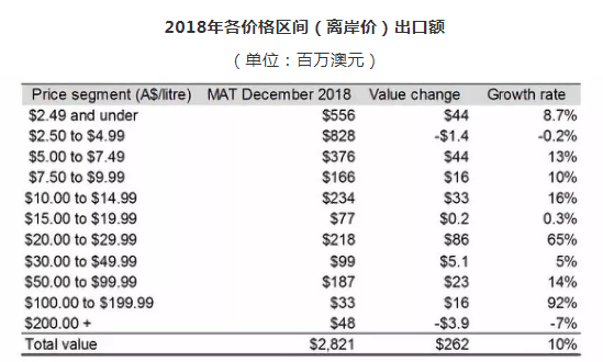 另一項(xiàng)新記錄是離岸價(jià)10澳元/L以上的出口額增長(zhǎng)了22%,達(dá)到8.95億澳元,超過2.50-4.99澳元/L的出口額,2.50-4.99澳元/L這個(gè)價(jià)格段曾經(jīng)長(zhǎng)時(shí)間占據(jù)著歷史上最大的出口份額。