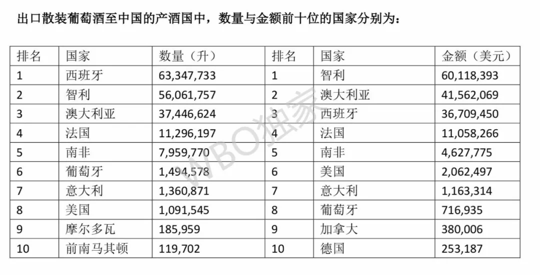 西班牙、智利、澳大利亞仍是散酒出口的大戶。而摩爾多瓦和前南馬其頓的入圍有可能是國(guó)家“一帶一路”倡議及相關(guān)政策扶持的結(jié)果。