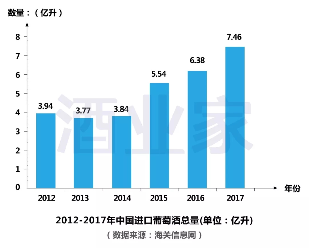 數(shù)據(jù)顯示,2017年1-12月,中國(guó)進(jìn)口葡萄酒總量為7.46億升,同比增長(zhǎng)16.88%,進(jìn)口總額為27.89億美元(折合人民幣約178億元),同比增長(zhǎng)17.96%。