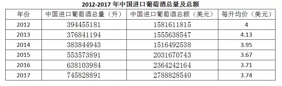 2017年中國(guó)進(jìn)口葡萄酒總量為7.46億升,同比增長(zhǎng)16.88%,進(jìn)口總額為27.89億美元,同比增長(zhǎng)17.96%,從均價(jià)來(lái)看,自2013年開(kāi)始連續(xù)2年下滑之后,2016年開(kāi)始有所回升,2017年均價(jià)為3.74美元/升。