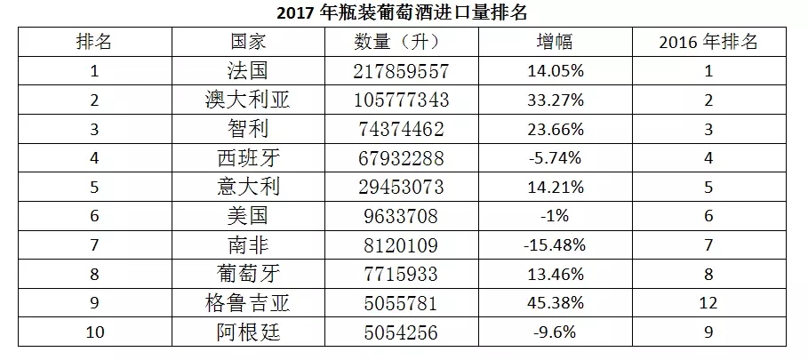 格魯吉亞成為2017年進(jìn)口瓶裝葡萄酒的一匹“黑馬”,從2016年的第12位躍居第9,它的進(jìn)口量增幅是前十大進(jìn)口量國(guó)家里最高的,達(dá)45.38%,2017年下半年,中國(guó)與格魯吉亞自貿(mào)協(xié)定生效,格魯吉亞葡萄酒實(shí)現(xiàn)了零關(guān)稅進(jìn)入中國(guó)市場(chǎng),由此可見(jiàn),關(guān)稅對(duì)于葡萄酒產(chǎn)國(guó)出口量的影響至關(guān)重要。