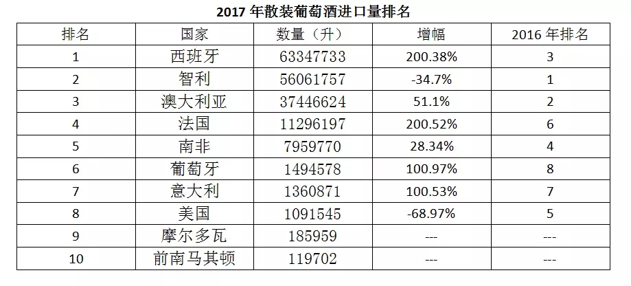 散裝葡萄酒進口量的排名相比2016年有了較大的變化,西班牙散裝葡萄酒以6334萬升的進口量,200%的驚人增幅躍居第一,超越了智利和澳大利亞。此前,智利一直是我國最大的散裝酒來源國,但2017年智利散裝酒進口量有所下滑,從數(shù)據(jù)上看,越來越多的智利酒以瓶裝出口的形式進入到中國市場,性價比進一步提升。