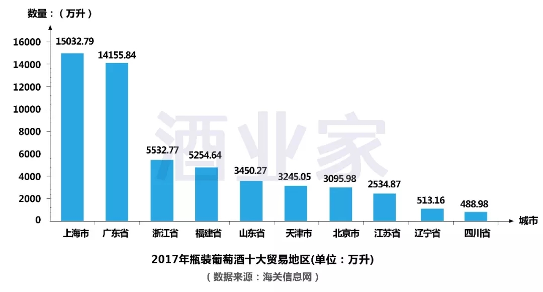 從數(shù)量上看,2017年瓶裝酒十大貿(mào)易地區(qū)排位與2016年基本一致,2017年上海市繼續(xù)占據(jù)瓶裝葡萄酒貿(mào)易第一的“寶座”,瓶裝葡萄酒貿(mào)易量約1.5億升,同比增長15%,約占瓶裝葡萄酒總量的27%。前十大貿(mào)易地區(qū)多為沿海且經(jīng)濟較發(fā)達的城市,山東省為我國主要的葡萄酒產(chǎn)區(qū)。