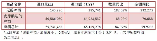 首月,啤酒進(jìn)口量額均實(shí)現(xiàn)八成左右的增幅,進(jìn)口量5973萬(wàn)升,同比增長(zhǎng)84.1%,進(jìn)口額6511萬(wàn)美元,同比增長(zhǎng)79.9%。