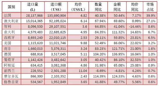 本月,進口瓶裝酒市場三駕馬車法國、澳大利亞、智利市場份額占比略有下降,合計75.6%,三者量額增幅均超四成;其他瓶裝酒進口來源地方面,數據基本面表現強勁,只有新西蘭量額雙雙走低。