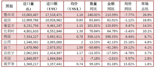 本月,進口啤酒整體呈增勢,但市場格局變化較大:墨西哥逆襲德國奪魁,量額均實現兩倍增幅,葡萄牙數據翻番首度進入三甲,荷蘭爆冷跌出三強之外,量額跌幅均超四成,貫穿去年全年的英國快車神話未能延續,量額小幅下跌。