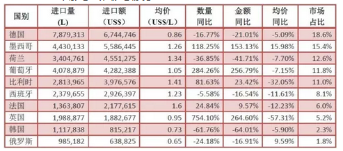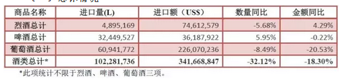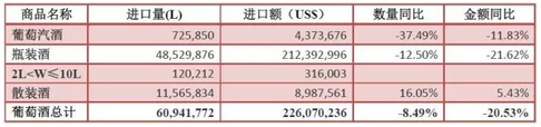 葡萄酒進(jìn)口整體下滑。瓶裝酒量額雙降,降幅較大;散裝酒量額均升;葡萄汽酒數(shù)量降幅明顯,金額小幅走低。瓶裝酒進(jìn)口額2.1億美元,同比下降21.6%,占葡萄酒進(jìn)口總額的近94%。同時,須指出的是,根據(jù)海關(guān)數(shù)據(jù),新增了大于2升、小于10升的葡萄酒分類,本月其進(jìn)口量為12萬升,進(jìn)口額為31萬美元,無同比。