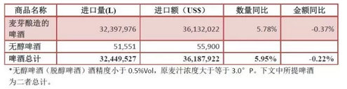 本月進(jìn)口啤酒量3245萬升,同比增長6.0%,進(jìn)口額3619萬美元,同比基本持平。根據(jù)海關(guān)數(shù)據(jù)調(diào)整,啤酒現(xiàn)在包括“麥芽釀造的啤酒”和“無醇啤酒”2項。其中,新增的無醇啤酒本月進(jìn)口量為5.2萬升,進(jìn)口額為6.0萬美元,均價1.08元/升,均無同比。