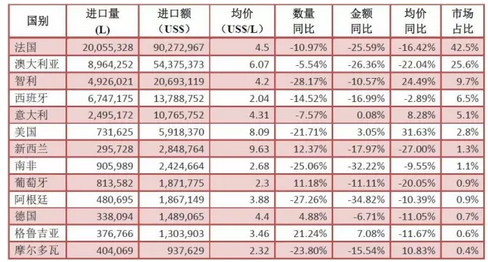 數(shù)據(jù)顯示,法國、澳大利亞、智利仍為進(jìn)口瓶裝酒市場的三駕馬車,三者市場份額占比合計近78%,但本月三馬齊喑,量額均呈下行態(tài)勢;另一方面,其他的瓶裝酒進(jìn)口來源地亦未擺脫陰霾,數(shù)據(jù)普遍走低,抑或勉強(qiáng)持平。