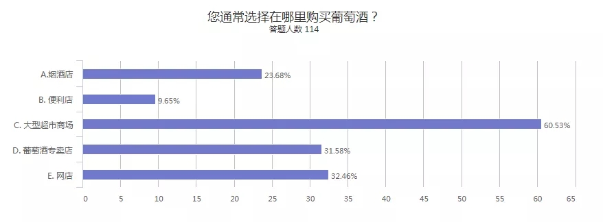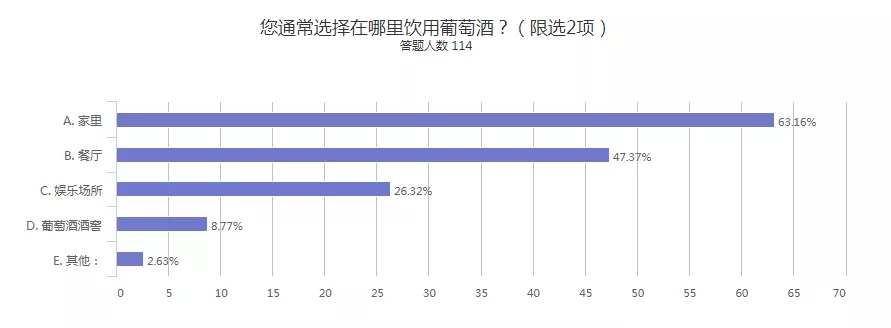 消費葡萄酒場合中有63%在家里,47%左右在餐飲,娛樂場所占了26%。家庭消費葡萄酒的比例大的主要原因在于,人們的生活水平提高,保健意識增強,追求時尚的消費理念正在逐步形成;夜場消費主要是啤酒和洋酒,葡萄酒目前受價格和消費習慣的影響,在夜場還只能是配角;此外,對于目前的年輕消費者來說,還沒有養成去葡萄酒酒窖喝酒的習慣。