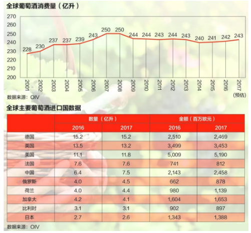 數據表明,2017年,全球葡萄酒產量在創下歷史低點的同時,葡萄酒消費和國際貿易繼續保持平穩增長。中國仍是全球葡萄酒市場最大的亮點,消費量增長了3.5%,進口量也大幅上升17%,達7.5億升,位居全球第四。