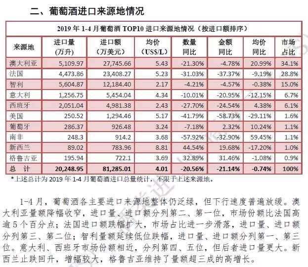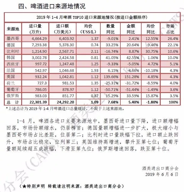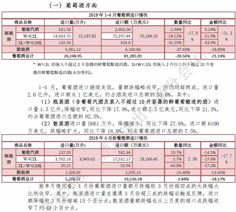 2019年1-4月酒類進(jìn)口統(tǒng)計分析