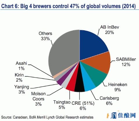 6月23日,由業內機構美銀美林(Bank of America Merrill Lynch)出具的調查報告顯示,世界上大約一半的啤酒生產來自以下四家著名的行業巨頭,包括百威英博(Anheuser-Busch InBev)、南非米勒(SABMiller)、喜力啤酒(Heineken)以及嘉士伯啤酒公司(Carlsberg)。