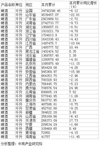 2015年1-8月生產啤酒34792298.45 千升,同比下降6.12 %。