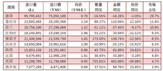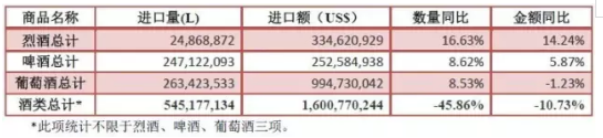 啤酒進口量額雙增,進口量2.5億升,同比增長8.6%,進口額2.5億美元,同比增長5.9%。