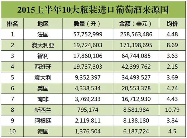 2015 上半年,瓶裝進口葡萄酒總量為 142,762,210 升,同比上漲 7.65%;進口總額為655,334,297 美元,同比上漲 2.16%;均價為 4.59 美元/升,同比下降 5%。瓶裝葡萄酒進口總量和總額有微幅上漲,而均價則有微幅下跌。