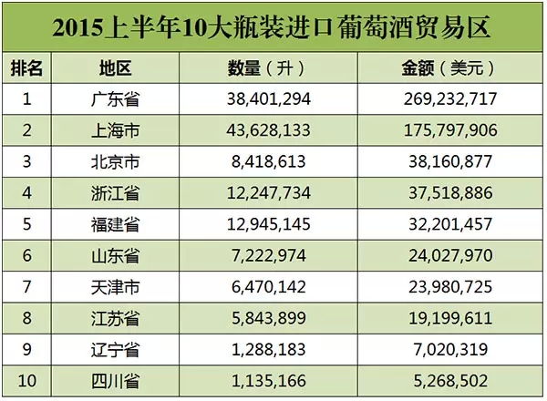(1)2015 上半年,葡萄酒總進口量為 193,940,636 升,同比上漲 13.43%。其中,散裝葡萄酒占 23.88%,瓶裝葡萄酒為 73.61%,起泡酒為 2.51%。由此可以看出,瓶裝葡萄酒依舊是主流。