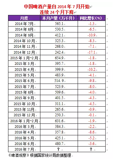 據統計,自2014年7月以來,國產啤酒產量已經連續下降24個月。