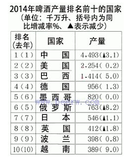 日本麒麟啤酒對(duì)171個(gè)國(guó)家和地區(qū)的啤酒產(chǎn)量進(jìn)行了調(diào)查。排名首位的中國(guó)雖然連續(xù)13年蟬聯(lián)第一,但與上一年相比減少了3.1%,時(shí)隔兩年出現(xiàn)了同比下滑。除受經(jīng)濟(jì)減速及“節(jié)儉令”的影響外,也與年輕人飲酒量減少有關(guān)。