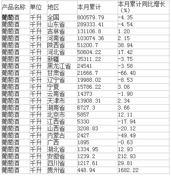 2015年1-9月生產葡萄酒800579.79 千升,同比下降4.35 %。