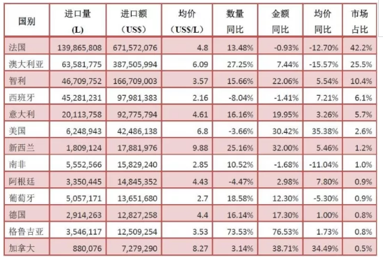 就9月份而言,瓶裝酒進口額2.6億美元,同比增長48.0%。從前五大進口來源地來看,自法國進口1.0億美元,同比增長40.4%;自澳大利亞進口7953萬美元,同比增長87.0%;自智利進口2417萬美元,同比增長26.9%;自西班牙進口1366萬美元,同比增長39.9%;自意大利進口1187萬美元,同比增長29.4%。上述五大進口來源地占我瓶裝葡萄酒9月份進口總額的90.9%。