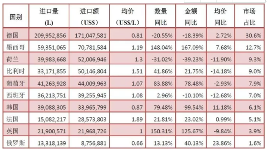 從進口企業(yè)方面看,啤酒進口市場的赫芬達爾—赫希曼指數(shù)為341,屬高度競爭市場。