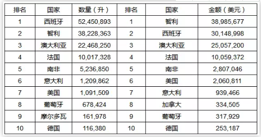 出口散裝葡萄酒至中國的產酒國中,1-9月數量與金額前十位的國家分別為: