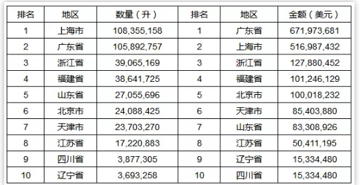 1-9月瓶裝葡萄酒進口量與進口額前十位的省市區分別為: