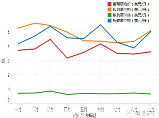 圖二:1-9月各類進(jìn)口葡萄酒月度價(jià)格趨勢(shì)(美元/升,2015)
