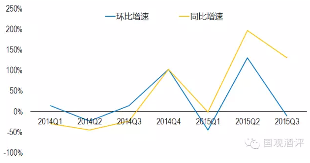 圖四:散裝酒季度進(jìn)口量增速趨勢(shì)(2015)