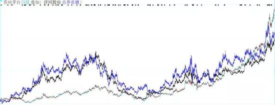很明顯,下方的是茅臺,黑線是洋河,藍線是古井貢。在2009年四萬億帶來的那撥白酒泡沫化過程中,茅臺沒怎么漲,洋河和古井可沒少漲;而2012年白酒塑化劑事件后殺估值的那撥下跌中,茅臺也沒怎么跌,洋河和古井的估值可是沒少殺。所以,2014年行業見底后,估值殺得厲害的先反彈了。