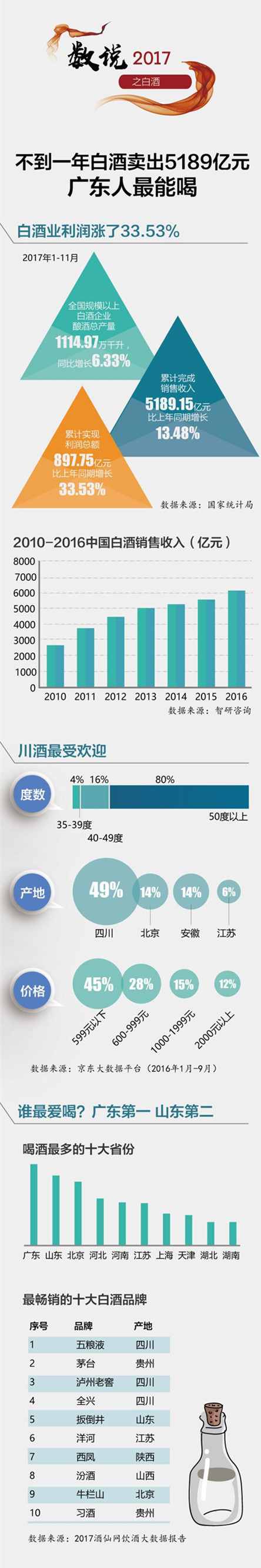 日前有報道稱,2017年1-11月,全國規(guī)模以上白酒企業(yè)累計完成銷售收入5189.15億元,比上年同期增長13.48%;累計實現(xiàn)利潤總額897.75億元,比上年同期增長33.53%。此外,近年來白酒銷售收入也是不斷提升。酒仙網(wǎng)數(shù)據(jù)顯示,2017年喝酒最多的省份當屬廣東、山東和北京。