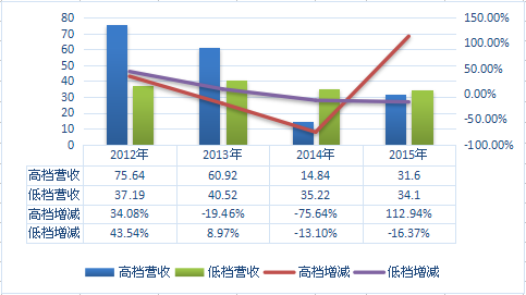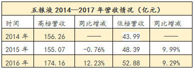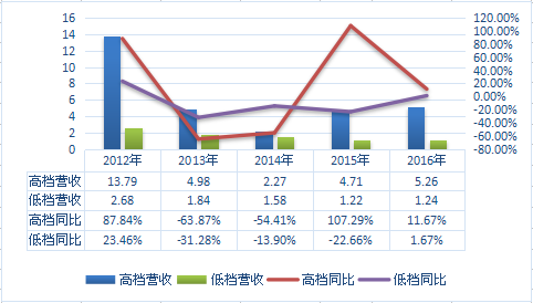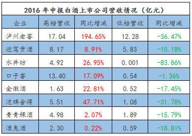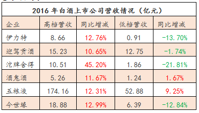 鑒于有多家上市酒企未公布年報的狀況,糖酒快訊又梳理了2016年中報中有高、低檔分類的企業,對比高檔酒和低檔酒的狀況,“冰火兩重天”的情況更加明顯;即使瀘州老窖、沱牌舍得、酒鬼酒等擁有成熟低檔品牌的企業也沒有止住下滑的勢頭。