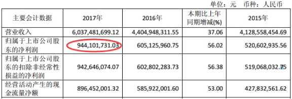 2017年山西汾酒營業(yè)收入為60.37億元,歸屬于上市公司股東的凈利潤9.44億元,經(jīng)營活動產(chǎn)生的現(xiàn)金流量凈額為8.96億元。