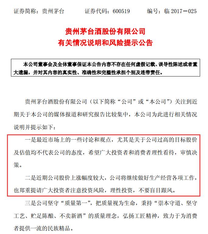 這么凌厲的漲勢連公司自己看著都怕。貴州茅臺16日晚間就發布公告,指出最近市場上的一些討論和觀點,尤其是關于公司過高的目標股價及估值均不代表公司的態度,希望廣大投資者和消費者理性看待,審慎決策。并表示,近期公司股價上漲幅度較大,公司將繼續做好生產經營各項工作,也鄭重提請廣大投資者注意投資風險,理性投資,不要盲目跟風。