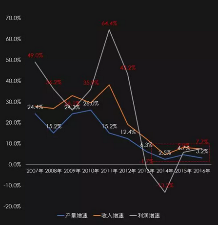圖4、2007-2016行業產量、銷量及利潤增速曲線