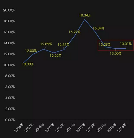 2014-2016年,行業凈利潤率都能維持在13%(利潤率=凈利潤/營收*100%)。