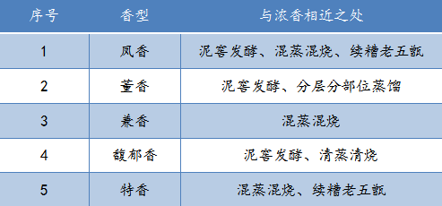 鳳香型與濃香型同樣采用泥窖發酵、混蒸混燒及續糟老五甑工藝,只是鳳香型增加了每年新泥替代老窖泥及特殊酒海貯存的工藝;董香型使用泥窖發酵并且采用香醅分層分部位蒸餾,但泥窖的窖壁材質不是濃香所用的窖泥而是當地白泥、石灰和楊桃藤浸泡汁制成;兼香型帶有濃香混蒸混燒的工藝環節;馥郁香型則有更近于濃香的泥窖發酵、清蒸清燒的工藝特征;特香的混蒸混燒、續糟老五甑工藝明顯有濃香的影子。