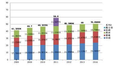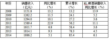 表三 2008年~2014年我國啤酒業銷售收入變化表