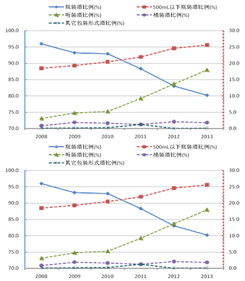 從2013年啤酒產品包裝形式上可以看出,我國啤酒產品主要仍以瓶裝酒為主,比例呈逐年下降趨勢,相比2007年降低了16.0百分點。500mL以上瓶裝啤酒下降幅度達30.8%,且公稱容量也由原來640mL為主,演變為如今個性化規格如500mL、530mL、580mL等等。500mL以下瓶裝酒比例逐年上升,2013年,達到25.6%,相比2007年提高了14.8個百分點。桶裝酒及其他包裝形式酒比例基本無太大變化。而聽裝酒在2008年~2010年維持了一個平穩的階段后,從2010年開始,比例呈直線上升趨勢,六年增幅達到325.9%,至2013年底,聽裝酒產量已占全國總產量的17.9%。