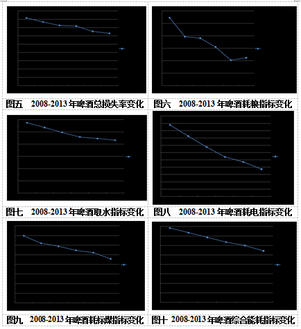 2013年與2007年相比,六年間,我國啤酒業單位產品耗糧降低3.2%,耗電下降17.9%,取水下降28.8%,耗標煤下降37.5%,綜合能耗下降了34.2%。啤酒損失率也由4.2%下降至3.2%。可見,在國家相關部門近年來陸續出臺的針對啤酒行業節能、降耗、減排等一系列促進措施和相關法律法規推動下,啤酒企業加強技術裝備和工藝改進以積極降低能耗指標取得了顯著成效。