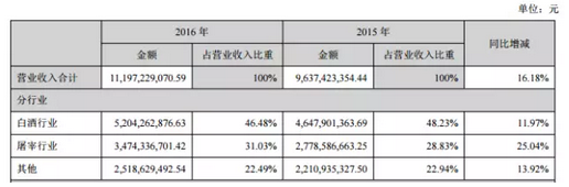 從2016年年報看,排位前三的依舊是“茅五洋”,其后的分別是瀘州老窖、古井貢。作為民酒龍頭企業(yè),牛欄山表現(xiàn)不凡,營收規(guī)模位列白酒上市公司第六。順鑫農(nóng)業(yè)白酒板塊(主要是牛欄山)營收達52.04億元,同比增長11.97%,占順鑫農(nóng)業(yè)營收比重為46.48%,產(chǎn)量從30萬噸增長到36萬噸,銷量從29萬噸增長到33萬噸。