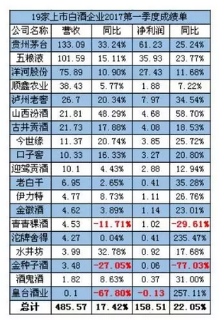 截止目前,白酒行業(yè)19家A股上市企業(yè)2017年一季度季報已經(jīng)披露完畢。19家企業(yè)2017年一季度營業(yè)總收入達(dá)485.57億元;凈利潤總額達(dá)158.51億元。19家企業(yè)中有16家企業(yè)營收同比正增長,17家企業(yè)凈利潤同比正增長。