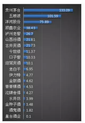 從單家企業(yè)來看,在營業(yè)收入排名方面:貴州茅臺2017年一季度營業(yè)收入達(dá)133.09億元,位居行業(yè)第一;五糧液和洋河股份分別以101.59億和75.59億,分列二三位。