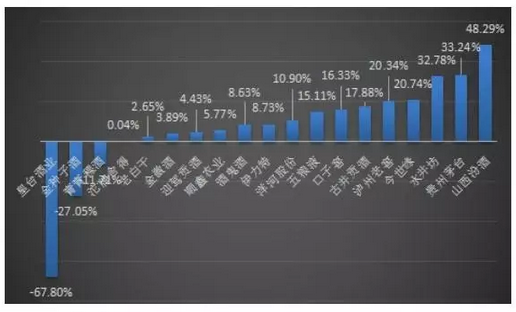 在正增長的企業(yè)當(dāng)中,山西汾酒以48.29%的增速位列榜首,茅臺和水井坊分列第二位和第三位。汾酒和皇臺之間的差額達(dá)到了116.09%。